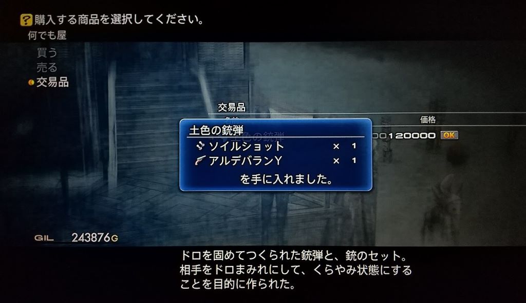 「銀色の液体」「土の魔晶石」「皇帝のウロコ」が揃ったらショップで売ると交易品「土色の銃弾」が入荷(再入荷なし)されます。