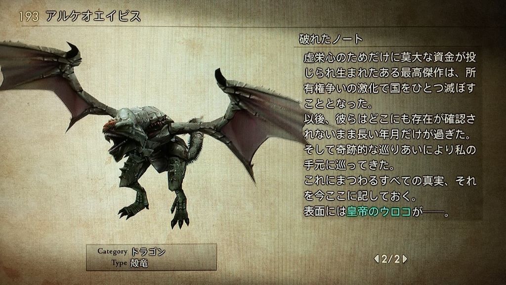 「皇帝のウロコ」は竜騎士の心得を入手した状態でアルケオエイビスを倒すと10%の確率でドロップします。